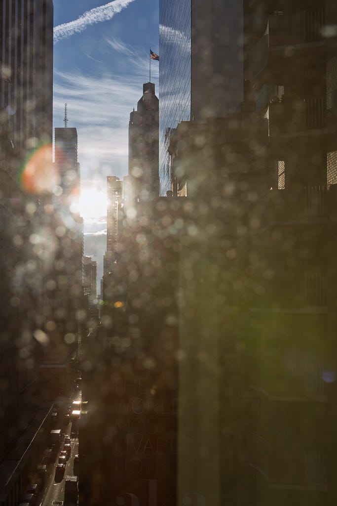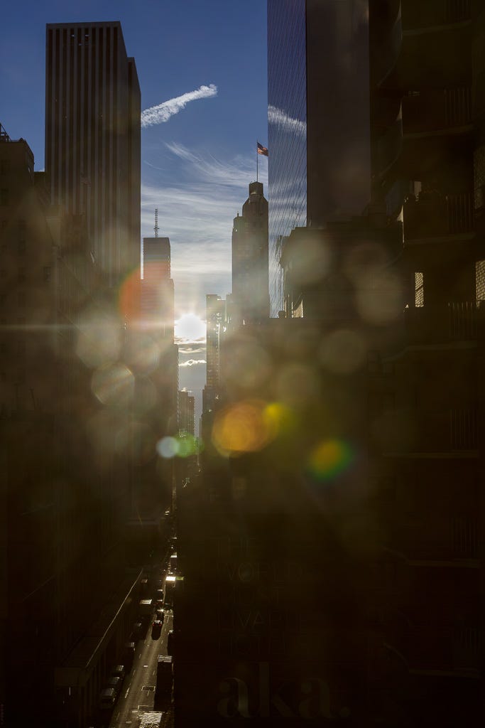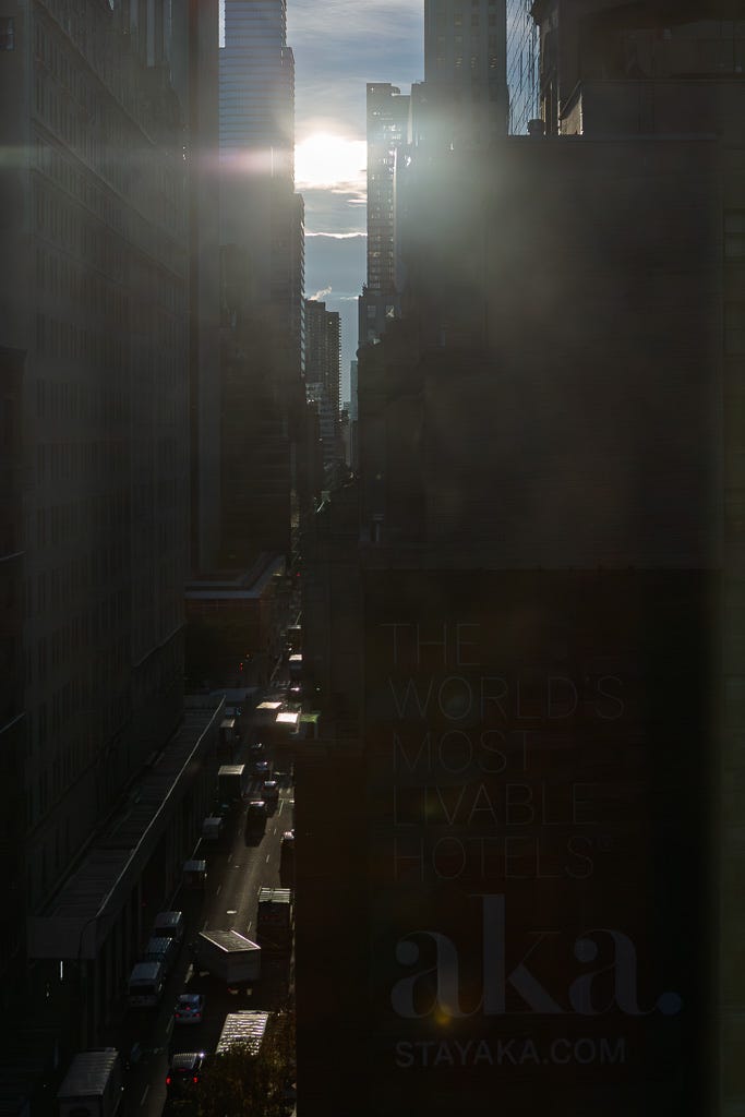 It was 7:14 a.m. when I opened the blackout shade in the hotel and saw amazing light. The sun was rising, just peeking around the edge of a skyscraper. Shafts of light were hitting parts of 58th Street while the rest was still in shadow.